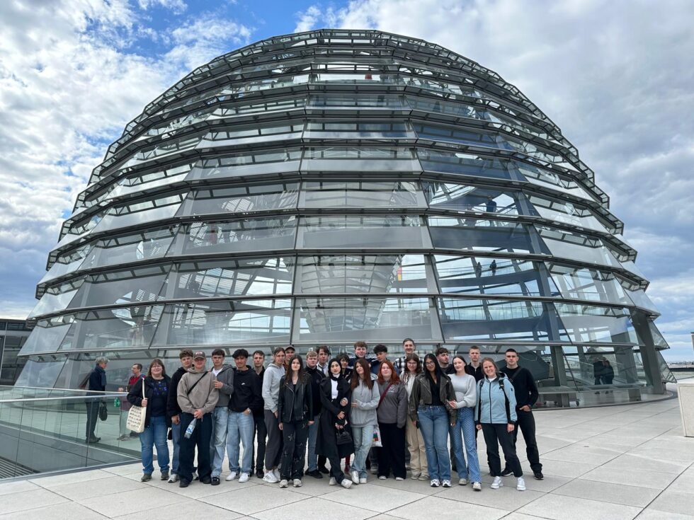 Ein Reisebericht der Klassen 10A und 10B Fünf Tage Hauptstadt, hunderte Erlebnisse und mindestens ebenso viele Schritte auf dem Schrittzähler: Unsere Klassenfahrt nach Berlin war ein voller Erfolg – wenn auch nicht ganz ohne kleinere Abenteuer und Zwischenfälle. Aber das gehört zu einer echten Abschlussfahrt schließlich dazu! Los ging’s am Montagmorgen ganz unspektakulär mit der S‑Bahn ab Kleinenbroich – Ziel: Berlin Ostbahnhof. Dort angekommen, bezogen wir direkt unsere Hotelzimmer. Danach machten wir die erste Erkundungstour zur East Side Mall – vorrangig für kulinarische Abenteuer wie Burger, Bowl oder Bubble Tea, manch einer kleidete sich aber auch schon direkt neu ein. Abends wurde es dann richtig bunt: Die Schülerdisco „Matrix“ erwartete uns mit Bass, Blitzlicht und Berliner Partyflair. Während sich einige gegen 22 Uhr freiwillig auf den Weg zurück ins Hotel machten, hielten die anderen tapfer bis zum Ende durch. Am Dienstag wurde ausgeschlafen – Frühstück erst um 9:30 Uhr! Danach hieß es: Schuhe polieren und los zum Discofox-Tanzkurs in den Berliner Süden. Anfangs noch verhalten, entwickelte sich der Kurs zu einer echten Stimmungskanone – inklusive nachträglicher Entschuldigungen für den anfänglichen Muffelmodus. Abends dann das Highlight: die spektakuläre Show der „Blue Man Group“. Ein Schüler wurde sogar auf der riesigen Leinwand gezeigt! Danach gabs eine kleine Berliner-Kulturlektion am „Späti“ – ohne Currywurst, dafür mit Softgetränken aus aller Welt. Am Mittwoch ging es ins DDR-Museum – geschichtlich wertvoll, aber offenbar weniger TikTok-tauglich für den Großteil unserer Schülerinnen und Schüler: Nach 30 Minuten war das Interesse bei Vielen eher in Richtung Mittagessen gelenkt. Nachmittags hieß es bei schönstem Sonnenschein: Leinen los! – Auf der Spree genossen wir Berliner Luft vom Boot aus. Abends ging es dann ins Burgerrestaurant „Peter Pane“. Trotz Tische-Chaos wurden doch noch alle satt. Und, weil Berlin bei Nacht einfach schön ist, hingen wir spontan mit einer kleinen Gruppe eine kleine Lichter-Stadtrundfahrt dran – Brandenburger Tor, Siegessäule, Checkpoint Charlie usw. alles dabei! Am Donnerstag ging es nach einem individuellen Mittagessen dank unseres Wahlkreisabgeordneten Herrn Heveling in den Bundestag – natürlich nicht ohne vorherige Sicherheitskontrolle. Dort lauschten wir einem interessanten Vortrag und genossen anschließend die beeindruckende Aussicht aus der Glaskuppel – bei bestem Wetter. Da Herr Heveling an dem Tag selbst Termine hatte, wurde das Gespräch mit ihm nach der Klassenfahrt in den Wahlkreis verschoben. Dazu an anderer Stelle mehr. (Verlinkung!) Am Abend wurde es noch einmal sportlich: Beim Bowling hieß es „Alle Neune!“ – Auch, wenn die Verpflegung eher Richtung Kantinenklassiker ging, war der Spaßfaktor eindeutig auf Strike-Niveau. Freitag war dann schließlich die Rückreise – eigentlich mit reservierten ICE-Sitzplätzen — geplant. Eigentlich! Nach der Zimmerkontrolle und als alles gepackt war, standen wir pünktlich am Berliner Ostbahnhof, um zu erfahren, dass der Wagen mit unseren gebuchten Sitzplätzen leider nicht mehr am ICE dran war. Der ICE war zudem überbucht, so dass wir alle hätten bis nach Düsseldorf stehen müssen und wir mit viel Überzeugungsarbeit im Servicecenter der Bahn einen Plan B organisiert haben: Zwei Stunden später dann endlich Abfahrt, dafür mit Sitzplätzen für alle. Und am Ende waren sich alle einig: Diese Fahrt bleibt unvergesslich – mit all ihren Highlights, kleinen Pannen und jeder Menge Berlin-Feeling. credit: N. Meissner, K. Bretz