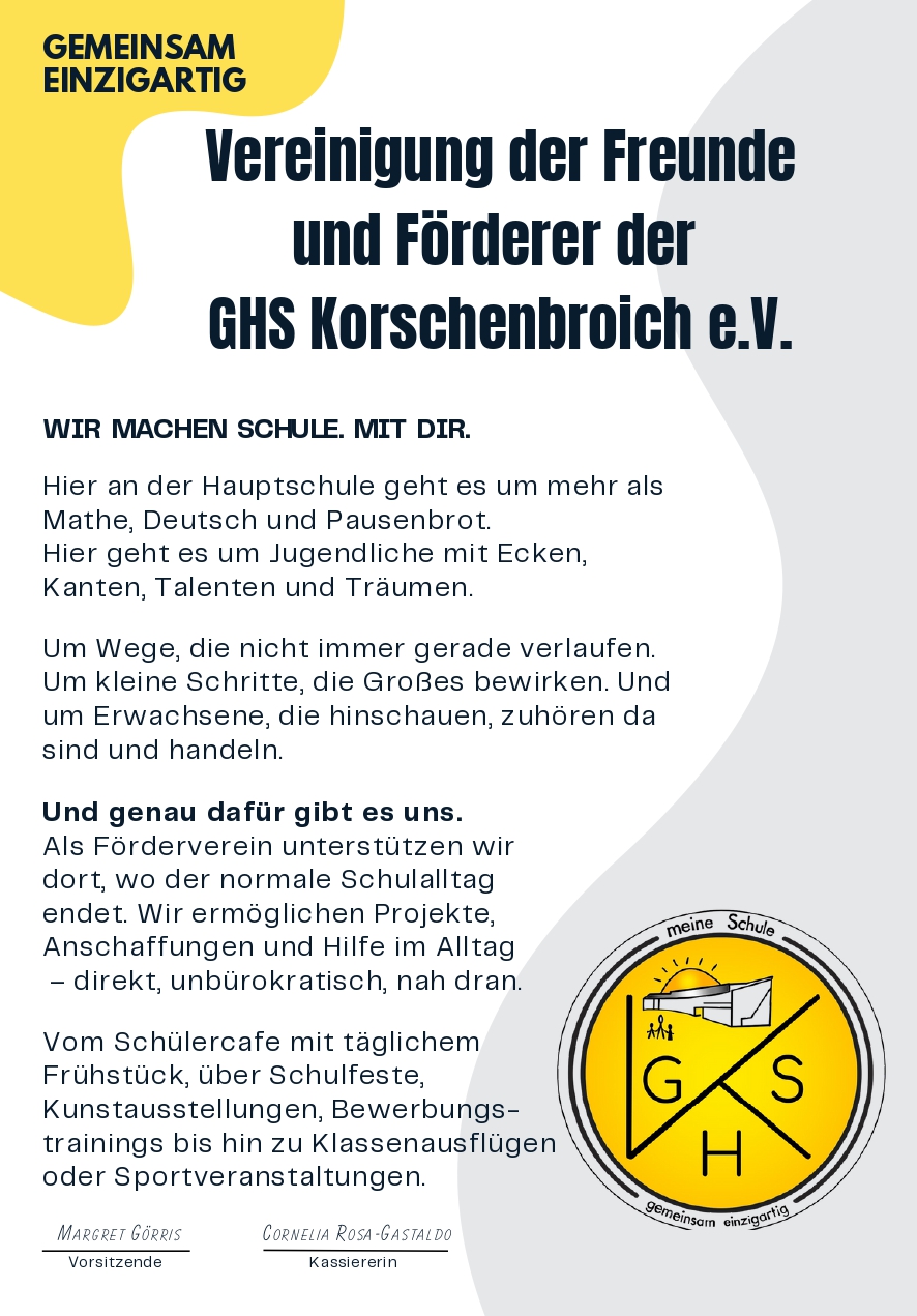 Wir freuen uns immer über neue Mitglieder und Unterstützer, die gemeinsam mit uns die Schülerinnen und Schüler an der GHS Korschenbroich fördern möchten. Wenn Sie Lust haben, aktiv zu werden oder uns auf andere Weise zu helfen, zögern Sie nicht, Kontakt mit uns aufzunehmen. Gemeinsam können wir viel bewegen!
